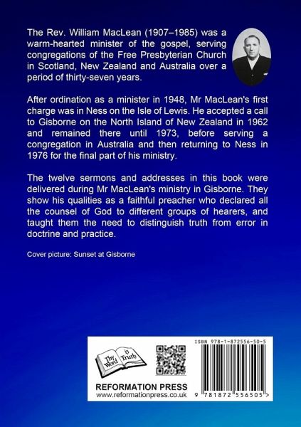 The twelve sermons and addresses in this book were delivered during the ministry of the Rev. William MacLean in the Free Presbyterian congregation of Gisborne, New Zealand. They show his qualities as a faithful preacher who declared all the counsel of God to different groups of hearers, and taught them the need to distinguish truth from error in doctrine and practice.