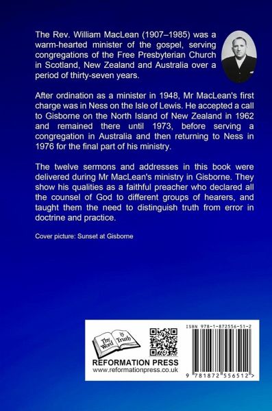 The twelve sermons and addresses in this book were delivered during the ministry of the Rev. William MacLean in the Free Presbyterian congregation of Gisborne, New Zealand. They show his qualities as a faithful preacher who declared all the counsel of God to different groups of hearers, and taught them the need to distinguish truth from error in doctrine and practice.