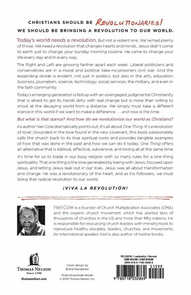 CHRISTIANS SHOULD BE REVOLUTIONARIES! WE SHOULD BE BRINGING A REVOLUTION TO OUR WORLD. Today's world needs a revolution. But not a violent one. We've had plenty of those. We need a revolution that changes hearts and minds. Jesus didn't come to earth just to change your Sunday morning routine. He came to change your life every day and in every way. The Right and Left are growing farther apart each week. Liberal politicians and conservatives are in a moral and political take-no-prisoners civil war. And the expanding divide is evident, not just in politics, but also in the arts, education, business, journalism, science, technology, social services, the military, and even in the faith community. Today's emerging generation is fed up with an unengaged, judgmental Christianity that is afraid to get its hands dirty with real change but is more than willing to shout at the decaying world from a distance. We simply must take a different stance in this world if we want to make a difference . . . and now is the time. But what is that stance? And how do we revolutionize our world as Christians? As author Neil Cole dramatically points out, it's all about One Thing. It's a revolution of love! Grounded in the love found in the new covenant, this book passionately calls the church back to its true spiritual roots and provides tangible examples of how that was done in the past and how we can do it today. One Thing offers an alternative that is biblical, effective, subversive, and loving all at the same time. It's time for us to trade in our busy religion with so many rules for a one-thing spirituality. That one thing is the love generated by being with Jesus, focused upon Jesus, and letting Jesus leak out in our lives. Jesus was all about transformation and change. He was a revolutionary of the heart, and as his followers, we must bring that radical revolution to our world. ¡VIVA LA REVOLUTIÓN!