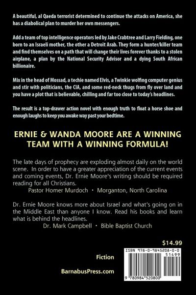 Book 1 of 4: The beautiful, al Qaeda terrorist determined to continue the attacks on America has a diabolical plan to murder her own messengers. Add a team of top intelligence operators led by Jake Crabtree and Larry Fielding, one born to an Israeli mother, the other a Detroit Arab. They form a hunter/killer team and find themselves on a path that will change their lives forever thanks to a stolen airplane, a plan by the National Security Advisor and a dying South African billionaire. Mix in the head of Mossad, a techie named Elvis, a Twinkie wolfing computer genius and stir with politicians, the CIA, and some red-neck thugs from fly over land and you have a plot that is believable, chilling and far too close to today's headlines. The result is a top-drawer action novel with enough truth to float a horse shoe and enough laughs to keep you awake way past your bedtime. ERNIE & WANDA MOORE ARE A WINNING TEAM WITH A WINNING FORMULA! The late days of prophecy are exploding almost daily on the world scene. In order to have a greater appreciation of the current events and coming events, Dr. Ernie Moore's writing should be required reading for all Christians. Pastor Homer Murdoch . Morganton, North Carolina Dr. Ernie Moore knows more about Israel and what's going on in the Middle East than anyone I know. Read his books and learn what is behind the headlines. Dr. Mark Campbell . Bible Baptist Church