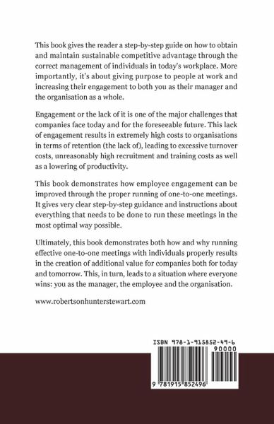 Unlock the key to sustainable competitive advantage with our book, providing a comprehensive step-by-step guide to effective management practices in today's dynamic workplace. Learn how purpose-driven leadership enhances engagement, benefiting both managers and the organization. Discover the critical impact of employee engagement on contemporary business challenges, such as retention costs, turnover expenses, and reduced productivity. Address these issues head-on with actionable insights from our book, offering a strategic approach to elevate engagement levels and drive organizational success. Explore the transformative power of one-to-one meetings in boosting employee engagement. Our book provides clear, detailed instructions to optimize the execution of these meetings, ensuring maximum effectiveness. Uncover the secrets to running these sessions in the most optimal way possible, minimizing costs and maximizing productivity. This book not only guides you through the 'how' but also explains the 'why' behind running effective one-to-one meetings. Witness the creation of additional value for companies, setting the stage for success today and tomorrow. Experience a win-win scenario for managers, employees, and the organization. For expert insights and a transformative approach to workplace management, visit www.robertsonhunterstewart.com. Elevate your leadership skills and foster a culture of engagement that propels your organization to new heights.