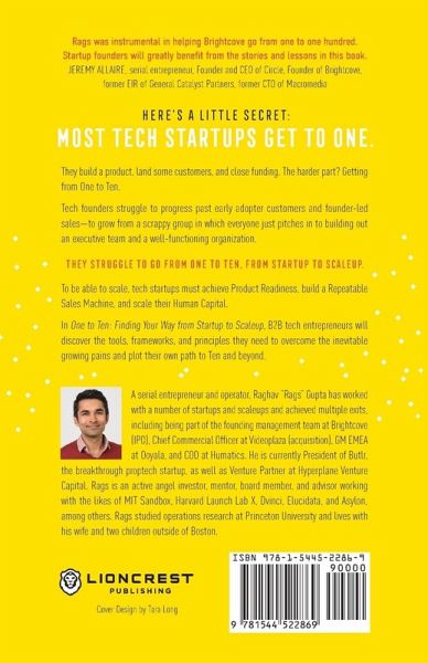Here's a little secret: Most tech startups get to One. They build a product, land some customers, and close funding. The harder part? Getting from One to Ten. Tech founders struggle to progress past early adopter customers and founder-led sales-to grow from a scrappy group in which everyone just pitches in to building out an executive team and a well-functioning organization. They struggle to go from One to Ten, from Startup to Scaleup. To be able to scale, tech startups must achieve Product Readiness, build a Repeatable Sales Machine, and scale their Human Capital. In One to Ten: Finding Your…mehr
