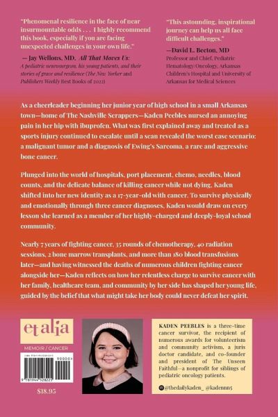 "Phenomenal resilience in the face of near insurmountable odds. I highly recommend this book, especially if you are facing unexpected challenges in your own life. Inspiring!" - Jay Wellons, MD, All That Moves Us: a pediatric neurosurgeon, his young patients, and their stories of grace and resilience (The New Yorker and Publishers Weekly Best Books of 2022) "Through Kaden's eyes, we see the world of childhood cancer patients. With grit, faith, and compassion . . . she is one true hero for the oncology community." - Naina S. Mahngar, MD, Medical Hematology/Oncology As a cheerleader beginning her junior year of high school in a small Arkansas town-home of The Nashville Scrappers-Kaden Peebles nursed an annoying pain in her hip with ibuprofen. What was first explained away and treated as a sports injury continued to escalate until a scan revealed the worst-case-scenario: a malignant tumor and a diagnosis of Ewing's Sarcoma, a rare and aggressive bone cancer. Plunged into the world of hospitals, port placement, chemo, needles, blood counts, and the delicate balance of killing cancer while not dying, Kaden shifted into her new identity as a 17-year-old with cancer. To survive physically and emotionally through three cancer diagnoses, Kaden would draw on every lesson she learned as a member of her highly-charged and deeply-loyal school community. Nearly 7 years of fighting cancer, 35 rounds of chemo, 40 radiation sessions, 2 bone marrow transplants, and more than 180 blood transfusions later-and having witnessed the deaths of numerous children fighting cancer alongside her-Kaden reflects on how her relentless charge to survive cancer with her family, healthcare team, and community by her side has shaped her young life, guided by the belief that what might take her body could never defeat her spirit.