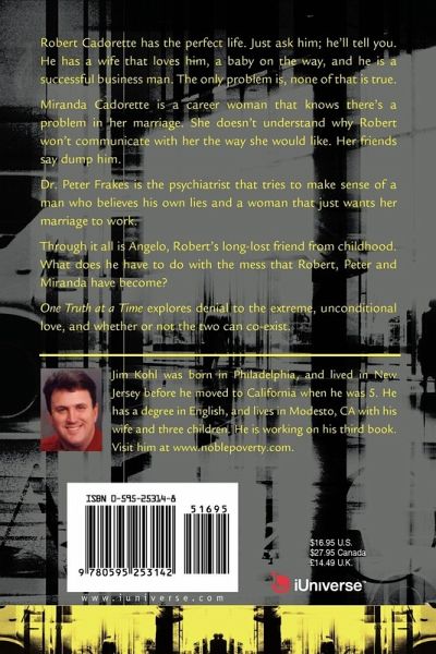 Robert Cadorette has the perfect life. Just ask him; he ll tell you. He has a wife that loves him, a baby on the way, and he is a successful business man. The only problem is, none of that is true. Miranda Cadorette is a career woman that knows there s a problem in her marriage. She doesn t understand why Robert won t communicate with her the way she would like. Her friends say dump him. Dr. Peter Frakes is the psychiatrist that tries to make sense of a man who believes his own lies and a woman that just wants her marriage to work. Through it all is Angelo, Robert s long-lost friend from childhood. What does he have to do with the mess that Robert, Peter and Miranda have become? One Truth at a Time explores denial to the extreme, unconditional love, and whether or not the two can co-exist.