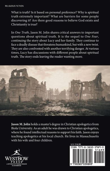 "What is truth? Is it based on personal preference? Why is spiritual truth extremely important? What are barriers for some people discovering it? Are there good reasons to believe God exists and Christianity is true?" "In One Truth, Jason M. Jolin shares critical answers to important questions about spiritual truth. It is the sequel to One Fear, continuing the story about Lucy and her family. They continue to face a deadly disease that threatens humankind, but with a new twist. They are also confronted with another terrifying danger. At various times, Lucy has discussions with different people about spiritual truth. The story ends leaving the reader wanting more."