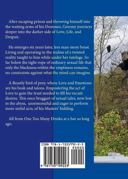 After escaping prison and throwing himself into the waiting arms of his Dommes, Geremy journeys deeper into the darker side of Love, Life, and Despair. He emerges 6 years later, less man more beast, living and operating in the realms of a twisted reality taught to him under her tutelage. So far below the tight-rope of ordinary life that only the blackness remains, removing him of all his inhibitions, freeing the inner beast to roam. A bird of prey where Love and Emotions are his beak and talons, tearing unsuspected Lovers off the rope where he once traveled, into the abyss beyond where he now lives. Unremorseful and eager to perform more sinful acts, of her bidding.