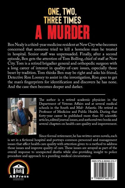 Ben Nealy is a third-year medicine resident at New City Hospital in Cincinatti. Ben's life is not complicated until he becomes concerned that someone tried to kill a homeless man he treated in hospital. Senior staff physicians were unpersuaded, partly because the patient disappeared. Shortly, however, the patient showed up in the Emergency Department after a second episode that Ben believes is another attempt on the man's life. This time, Ben gets the attention of Tom Bolling, chief of staff at New City. Tom is a retired air force brigadier general and orthopedic surgeon with a long career of interest in quality-of-care issues, especially those beset by tradition. Tom thinks Ben may be right and asks his friend Detective Ron Looney to assist in the investigation. When Ron goes to get the man's fingerprints for identification and discovers the man has no fingerprints; the case seems to take a very dark turn at that point. A combination of medical clues and police attention to detail develop a reasonable hypothesis after a third attempt of the man's life. Tom Bolling and his administrative staff manage an elaborate meeting with a suspect that allows Detective Looney to collect unusual data to solve the case.