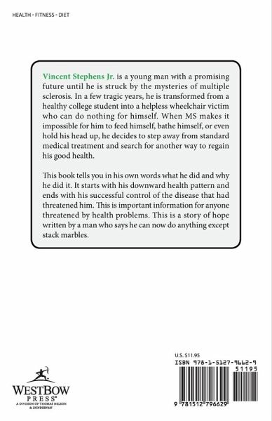 Vincent Stephens Jr. is a young man with a promising future until he is struck by the mysteries of multiple sclerosis. In a few tragic years, he is transformed from a healthy college student into a helpless wheelchair victim who can do nothing for himself. When MS makes it impossible for him to feed himself, bathe himself, or even hold his head up, he decides to step away from standard medical treatment and search for another way to regain his good health. This book tells you in his own words what he did and why he did it. It starts with his downward health pattern and ends with his successful control of the disease that had threatened him. This is important information for anyone threatened by health problems. This is a story of hope written by a man who says he can now do anything except stack marbles.
