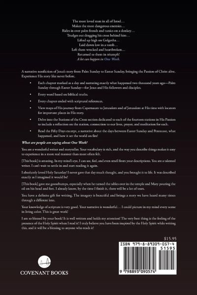 The most loved man in all of Israel... Makes the most dangerous enemies... Rides in over palm fronds and tunics on a donkey... Trudges out dragging his cross behind him... Lifted up high on Golgotha... Laid down low in a tomb... Left them wrecked and heartbroken... Returned to them in triumph! A lot can happen in One Week. A narrative nonfiction of Jesus's story from Palm Sunday to Easter Sunday, bringing the Passion of Christ alive. Experience His story like never before. Each chapter marked as a day and narrating exactly what happened two thousand years ago--Palm Sunday through Easter Sunday--for Jesus and His followers and disciples. Every word based on biblical truths. Every chapter ended with scriptural references. View maps of His journey from Capernaum to Jerusalem and of Jerusalem at His time with locators for important places in His story. Delve into the Stations of the Cross section dedicated to each of the fourteen stations in His Passion to include a reflection on the station, connection to our lives, prayer, and meditation for each. Read the Fifty Days excerpt, a narrative about the days between Easter Sunday and Pentecost, what happened, and how it set the world on fire! What are people are saying about One Week? You are a wonderful writer and storyteller. Your vocabulary is rich, and the way you describe things makes it easy to experience in a more real manner than most often felt. [This book] is amazing. In my mind's eye, I can see, feel, and even smell from your descriptions. You are a talented writer. I can't wait to settle in and start reading it again. I absolutely loved Holy Saturday! I never gave that day much thought, and you brought it to life. It was described exactly as I imagined it would be! [This book] gave me goosebumps, especially when he turned the tables over in the temple and Mary pouring the oil on his head and feet. I already know, by the time I finish it, there will be a lot of tears. You have a definite gift for writing. The imagery is beautiful and brings a story we have heard many times through a different lens. Your knowledge of scripture is very good. Your narrative is wonderful... I could picture in my mind every scene in living color. This is great work! I am so blessed by your book! It is well written and holds my attention! The very best thing is the feeling of the presence of the Holy Spirit when I read it! I truly believe you have been inspired by the Holy Spirit while writing this, and it will be a blessing to anyone who reads it! I am so blessed by your book! It is well written and holds my attention! The very best thing is the feeling of the presence of the Holy Spirit when I read it! I truly believe you have been inspired by the Holy Spirit while writing this, and it will be a blessing to anyone who reads it!