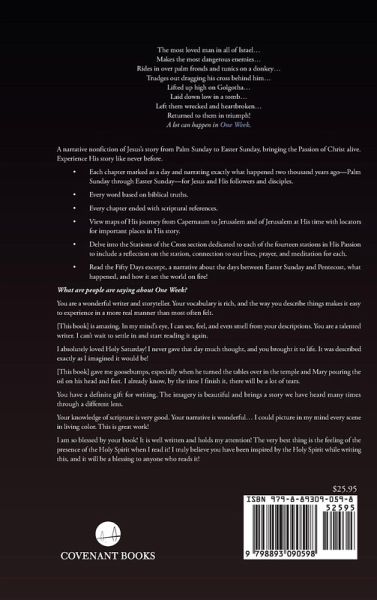 The most loved man in all of Israel... Makes the most dangerous enemies... Rides in over palm fronds and tunics on a donkey... Trudges out dragging his cross behind him... Lifted up high on Golgotha... Laid down low in a tomb... Left them wrecked and heartbroken... Returned to them in triumph! A lot can happen in One Week. A narrative nonfiction of Jesus's story from Palm Sunday to Easter Sunday, bringing the Passion of Christ alive. Experience His story like never before. Each chapter marked as a day and narrating exactly what happened two thousand years ago--Palm Sunday through Easter Sunday--for Jesus and His followers and disciples. Every word based on biblical truths. Every chapter ended with scriptural references. View maps of His journey from Capernaum to Jerusalem and of Jerusalem at His time with locators for important places in His story. Delve into the Stations of the Cross section dedicated to each of the fourteen stations in His Passion to include a reflection on the station, connection to our lives, prayer, and meditation for each. Read the Fifty Days excerpt, a narrative about the days between Easter Sunday and Pentecost, what happened, and how it set the world on fire! What are people are saying about One Week? You are a wonderful writer and storyteller. Your vocabulary is rich, and the way you describe things makes it easy to experience in a more real manner than most often felt. [This book] is amazing. In my mind's eye, I can see, feel, and even smell from your descriptions. You are a talented writer. I can't wait to settle in and start reading it again. I absolutely loved Holy Saturday! I never gave that day much thought, and you brought it to life. It was described exactly as I imagined it would be! [This book] gave me goosebumps, especially when he turned the tables over in the temple and Mary pouring the oil on his head and feet. I already know, by the time I finish it, there will be a lot of tears. You have a definite gift for writing. The imagery is beautiful and brings a story we have heard many times through a different lens. Your knowledge of scripture is very good. Your narrative is wonderful... I could picture in my mind every scene in living color. This is great work! I am so blessed by your book! It is well written and holds my attention! The very best thing is the feeling of the presence of the Holy Spirit when I read it! I truly believe you have been inspired by the Holy Spirit while writing this, and it will be a blessing to anyone who reads it! I am so blessed by your book! It is well written and holds my attention! The very best thing is the feeling of the presence of the Holy Spirit when I read it! I truly believe you have been inspired by the Holy Spirit while writing this, and it will be a blessing to anyone who reads it!