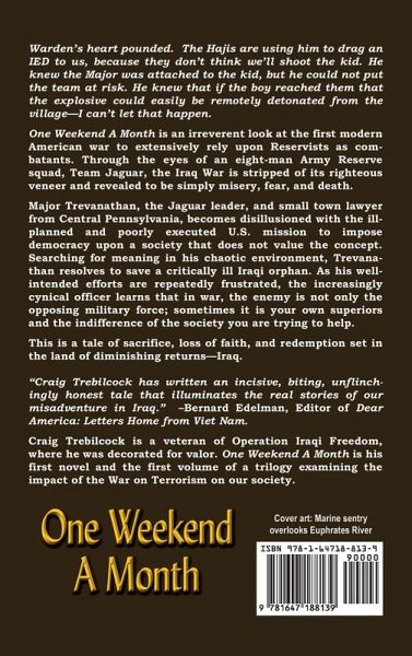 One Weekend A Month is an irreverent look at the first modern American war to extensively rely upon Reservists as combatants. Through the eyes of an eight-man civil affairs squad, Team Jaguar, the Iraq War is stripped of its righteous veneer and revealed to be fear, suffering, and chaos. Major Trevanthan, the Jaguar Team leader and small town attorney from Pennsylvania, becomes disillusioned with the ill-planned and poorly executed US mission to impose democracy upon a society that does not value the concept. Searching for meaning in his environment, Trevanathan resolves to save a critically ill Iraqi orphan. As his well intentioned efforts are repeatedly frustrated, the increasingly cynical officer learns that in war, the enemy is not only the opposing military force; sometimes it is the self-interest of your own superiors and the indifference of the society you are trying to help. This is a tale of sacrifice, loss of faith, and redemption set in the land of diminishing returns - Iraq. "Craig Trebilcock has written an incisive, biting, unflinchingly honest tale that illuminates the real stories of our misadventure in Iraq." - Bernard Edelman, Editor of Dear America: Letters Home from Viet Nam. The author is a veteran of Operation Iraqi Freedom, where he was decorated for valor. As a JAG and Civil Affairs officer during the invasion and subsequent occupation of Iraq, then Lieutenant Colonel Trebilcock coordinated reconstruction of the Iraqi legal system in Southern Iraq. His purpose in writing this book is to reveal the side of the Iraq War that neither the general Press nor the White House show the American people.