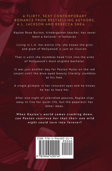 One Wild Night is a fun, flirty side-project written by Rebecca Shea and A.L. Jackson. This 40,000 word short novel is a departure from what they typically write. Enjoy! Kaylee Rose Burton, kindergarten teacher, has never been a believer in fantasies. Living in L.A. her entire life, she knows the glitz and glam of Hollywood is just an illusion. That is until she stumbles head first into the arms of Hollywood's most eligible bachelor. It was just another day for Paxton Myles on the red carpet until the blue-eyed beauty literally stumbles at his feet. A single glimpse in her innocent eyes and he knows he has to have her. After one night of unbridled passion, Kaylee slips away to live her quiet life, but the paparazzi has other ideas. When Kaylee's world comes crashing down, can Paxton convince her that their one wild night could turn into forever? A flirty, sexy contemporary romance from bestselling authors, A.L. Jackson and Rebecca Shea . . .