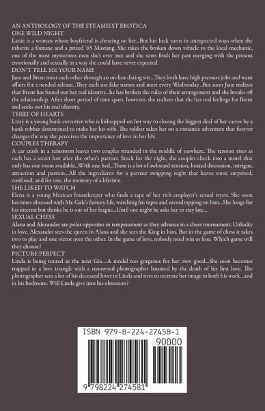 AN ANTHOLOGY OF THE STEAMIEST EROTICA ONE WILD NIGHT Lanie is a woman whose boyfriend is cheating on her...But her luck turns in unexpected ways when she inherits a fortune and a prized '65 Mustang. She takes the broken down vehicle to the local mechanic, one of the most mysterious men she's ever met and she soon finds her past merging with the present emotionally and sexually in a way she could have never expected. DON'T TELL ME YOUR NAME Jane and Brent meet each other through an on-line dating site...They both have high pressure jobs and want affairs for a needed release...They each use fake names and meet every Wednesday...But soon Jane realizes that Brent has found out her real identity...he has broken the rules of their arrangement and she breaks off the relationship. After short period of time apart, however, she realizes that she has real feelings for Brent and seeks out his real identity. THIEF OF HEARTS Lizzy is a young bank executive who is kidnapped on her way to closing the biggest deal of her career by a bank robber determined to make her his wife. The robber takes her on a romantic adventure that forever changes the way she perceives the importance of love in her life. COUPLES THERAPY A car crash in a rainstorm leaves two couples stranded in the middle of nowhere. The tension rises as each has a secret lust after the other's partner. Stuck for the night, the couples check into a motel that only has one room available...With one bed...There is a lot of awkward tension, heated discussion, intrigue, attraction and passion...All the ingredients for a partner swapping night that leaves some surprised, confused, and for one, the memory of a lifetime. SHE LIKED TO WATCH Elena is a young Mexican housekeeper who finds a tape of her rich employer's sexual trysts. She soon becomes obsessed with Mr. Gale's fantasy life, watching his tapes and eavesdropping on him...She longs for his interest but thinks he is out of her league...Until one night he asks her to stay late... SEXUAL CHESS Alana and Alexander are polar opposites in temperament as they advance in a chess tournament. Unlucky in love, Alexander sees the queen in Alana and she sees the King in him. But in the game of chess it takes two to play and one victor over the other. In the game of love, nobody need win or lose. Which game will they choose? PICTURE PERFECT Linda is being touted as the next Gia....A model too gorgeous for her own good...She soon becomes trapped in a love triangle with a renowned photographer haunted by the death of his first love. The photographer sees a lot of his deceased lover in Linda and tires to recreate her image in both his work...and in his bedroom. Will Linda give into his obsession?
