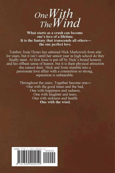 Erotic vignettes into one couple's life and love throughout the years. What starts as a crush can become one's love of a lifetime. It is the fantasy that transcends all others-the one perfect love. Tomboy Josie Hynes has admired Nick Markovich from afar for years, but it isn't until her senior year in high school do they finally meet. At first Josie is put off by Nick's brutal honesty and his offbeat sense of humor, but it is their physical attraction she cannot deny. Nick and Josie stumble into a passionate love affair with a connection so strong, separation is unbearable. Throughout the years, Together become one-One with the good times and the bad, One with happiness and sadness, One with laughter and tears, One with sickness and health. One with the wind.
