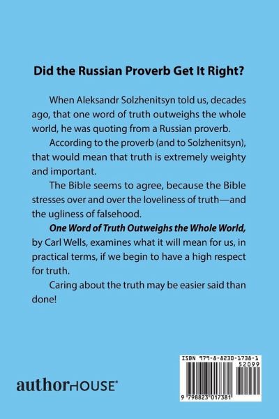 When Aleksandr Solzhenitsyn told us, decades ago, that one word of truth outweighs the whole world, he was quoting from a Russian proverb. According to the proverb (and to Solzhenitsyn), that would mean that truth is extremely weighty and important. The Bible seems to agree, because the Bible stresses over and over the loveliness of truth-and the ugliness of falsehood. One Word of Truth Outweighs the Whole World, by Carl Wells, examines what it will mean for us, in practical terms, if we begin to have a high respect for truth. Caring about the truth may be easier said than done!