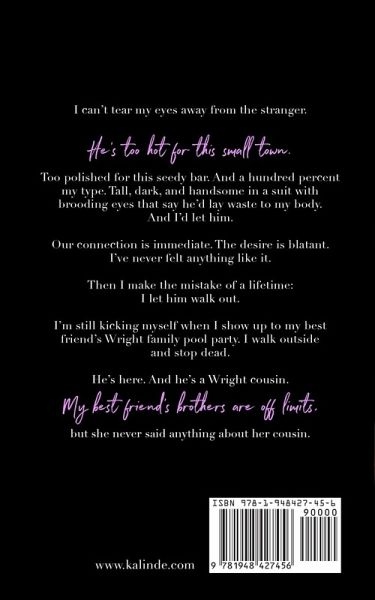 A one-night stand prequel romance to USA Today bestselling author K.A. Linde's Wright with Benefits... I can't tear my eyes away from the stranger. He's too hot for this small town. Too polished for this seedy bar. And a hundred percent my type. Tall, dark, and handsome in a suit with brooding eyes that say he'd lay waste to my body. And I'd let him. Our connection is immediate. The desire is blatant. I've never felt anything like it. Then I make the mistake of a lifetime: I let him walk out. I'm still kicking myself when I show up to my best friend's Wright family pool party. I walk outside and stop dead. He's here. And he's a Wright cousin. My best friend's brothers are off limits, but she never said anything about her cousin.