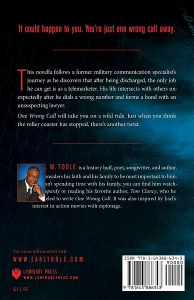 t could happen to you. You're just one wrong call away. This novella follows a former military communication specialist's journey as he discovers that after being discharged, the only job he can get is as a telemarketer. His life intersects with others unexpectedly after he dials a wrong number and forms a bond with an unsuspecting lawyer. ¿One Wrong Call will take you on a wild ride. Just when you think the roller coaster has stopped, there's another twist.