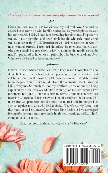 He came home a hero and lost the only woman he's ever loved... John I have no idea how to survive without my beloved Ava. She had no choice but to move on with her life during my six-year deployment and has now married Eric. I hate him for taking her from me. I'd prefer to wallow in my depression and heartbreak, but the whole damned world wants a piece of the SEAL Team leader who helped capture the world's most-wanted terrorist. I need help handling the relentless requests, and when Ava sends her new sister-in-law to manage the media circus for me, I'm prepared to hate her on principle. Her brother took my Ava. What else do I need to know about her? Julianne It takes five seconds to realize Ava's ex will be the most complicated and difficult client I've ever had, but the opportunity to represent the most celebrated man in the world could make my career. I'm determined to do the job, even if I dislike John from the moment I meet him. And I like everyone. So much so that my brothers worry about me being exploited by those who would take advantage of my unwavering love for others. But John... He's in a class by himself, and his bitterness is a festering wound that I begin to wish I could somehow fix for him. The more time we spend together, the more our mutual disdain morphs into something that feels an awful lot like desire. There's no way I can want this man, or so I tell myself, and when Eric finds out I've developed feelings for the man causing trouble in his new marriage, well... That's going to be a hot mess. Read the hotly anticipated sequel to Five Years Gone!