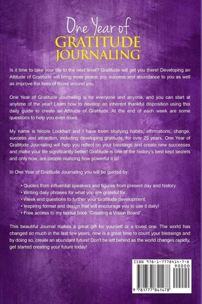 Is it time to take your life to the next level? Gratitude will get you there! Developing an Attitude of Gratitude will bring inner peace, joy, success and abundance to you as well as improve the lives of those around you. One Year of Gratitude Journaling is for everyone and anyone, and you can start at anytime of the year! Learn how to develop an inherent thankful disposition using this daily guide to create an Attitude of Gratitude. At the end of each week are some questions to help you even more. My name is Nicole Lockhart and I have been studying habits, affirmations, change, success and attraction, including developing gratitude, for over 25 years. One Year of Gratitude Journaling will help you reflect on your blessings and create new successes and make your life significantly better! Gratitude is one of the history's best kept secrets and only now, are people realizing how powerful it is! In One Year of Gratitude Journaling you will be guided by: ¿ Quotes from influential speakers and figures from present day and history. ¿ Writing daily phrases for what you are grateful for. ¿ Week end questions to further your Gratitude development. ¿ Inspiring format and design that will encourage you to use it daily! ¿ Free access to my bonus book "Creating a Vision Board". This beautiful Journal makes a great gift for yourself or a loved one. The world has changed so much in the last few years, now is a great time to count your blessings and by doing so, create an abundant future! Don't be left behind as the world changes rapidly, get started creating your future today!