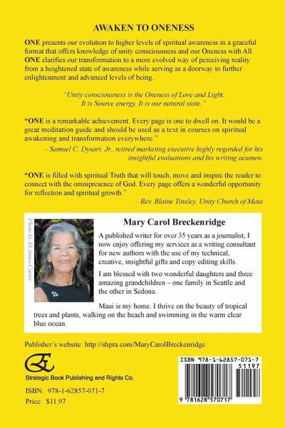 AWAKEN TO ONENESS ONE presents our evolution to higher levels of spiritual awareness in a graceful format that offers knowledge of unity consciousness and our Oneness with All. ONE clarifies our transformation to a more evolved way of perceiving reality from a heightened state of awareness while serving as a doorway to further enlightenment and advanced levels of being. "Unity consciousness is the Oneness of Love and Light. It is Source energy. It is our natural state." "ONE is a remarkable achievement. Every page is one to dwell on. It would be a great meditation guide and should be used as a text in courses on spiritual awakening and transformation everywhere." ~ Samuel C. Dysart, Jr., retired marketing executive highly regarded for his insightful evaluations and his writing acumen. "ONE is filled with spiritual Truth that will touch, move and inspire the reader to connect with the omnipresence of God. Every page offers a wonderful opportunity for reflection and spiritual growth." ~ Rev. Blaine Tinsley, Unity Church of Maui Mary Carol Breckenridge A published writer for over 35 years as a journalist, I now enjoy offering my services as a writing consultant for new authors with the use of my technical, creative, insightful gifts and copy editing skills. I am blessed with two wonderful daughters and three amazing grandchildren - one family in Seattle and the other in Sedona. Maui is my home. I thrive on the beauty of tropical trees and plants, walking on the beach and swimming in the warm clear blue ocean. Publisher's website: http://sbpra.com/MaryCarolBreckenridge