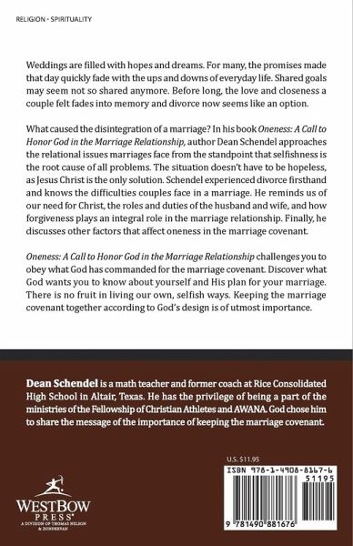Weddings are filled with hopes and dreams. For many, the promises made that day quickly fade with the ups and downs of everyday life. Shared goals may seem not so shared anymore. Before long, the love and closeness a couple felt fades into memory and divorce now seems like an option. What caused the disintegration of a marriage? In his book Oneness: A Call to Honor God in the Marriage Relationship, author Dean Schendel approaches the relational issues marriages face from the standpoint that selfishness is the root cause of all problems. The situation doesn't have to be hopeless, as Jesus Christ is the only solution. Schendel experienced divorce firsthand and knows the difficulties couples face in a marriage. He reminds us of our need for Christ, the roles and duties of the husband and wife, and how forgiveness plays an integral role in the marriage relationship. Finally, he discusses other factors that affect oneness in the marriage covenant. Oneness: A Call to Honor God in the Marriage Relationship challenges you to obey what God has commanded for the marriage covenant. Discover what God wants you to know about yourself and His plan for your marriage. There is no fruit in living our own, selfish ways. Keeping the marriage covenant together according to God's design is of utmost importance.