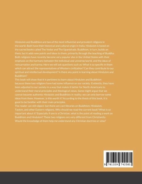 Hinduism and Buddhism are two of the most influential and prevalent religions in the world. Both have their historical and cultural origin in India. Hinduism is based on the sacred books called The Vedas and The Upanishads. Buddhism, in turn, builds on them, but it adds new points and ideas to them, primarily through the teaching of Buddha. Both religions have recently become very popular also in the United States with their emphasis on the harmony between the individual and universe/world, and the ideas of reincarnation and karma. Here we will ask questions such as: What is so specific in them which can attract the representatives of Western civilization? Can they contribute to our spiritual and intellectual development? Is there any point in learning about Hinduism and Buddhism? This book will show that it is pertinent to learn about Hinduism and Buddhism because these two religions have had some influence on our society. Evidently, they have been adjusted to our society in a way that makes it better for North Americans to understand their moral principles and theological views. Some might argue that we cannot become authentic Hinduists and Buddhists in reality; we can only borrow some ideas from them. However, is this worth it? According to the thesis of this book, it is good to be familiar with their main principles. The reader can still object: but there are vast libraries on Buddhism, Hinduism, Taoism, and other Eastern religions. Why should we read the current book? What is so important about it? Especially if one is a Christian, what is the point of reading a work on Buddhism and Hinduism? These two religions are very different from Christianity. Would the knowledge of them help me understand any Christian doctrine or view?