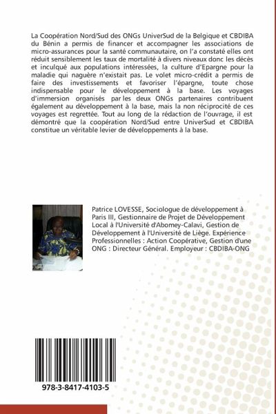 La Coopération Nord/Sud des ONGs UniverSud de la Belgique et CBDIBA du Bénin a permis de financer et accompagner les associations de micro-assurances pour la santé communautaire, on l'a constaté elles ont réduit sensiblement les taux de mortalité à divers niveaux donc les décès et inculqué aux populations intéressées, la culture d'Epargne pour la maladie qui naguère n'existait pas. Le volet micro-crédit a permis de faire des investissements et favoriser l'épargne, toute chose indispensable pour le développement à la base. Les voyages d'immersion organisés par les deux ONGs partenaires contribuent également au développement à la base, mais la non réciprocité de ces voyages est regrettée. Tout au long de la rédaction de l'ouvrage, il est démontré que la coopération Nord/Sud entre UniverSud et CBDIBA constitue un véritable levier de développements à la base.
