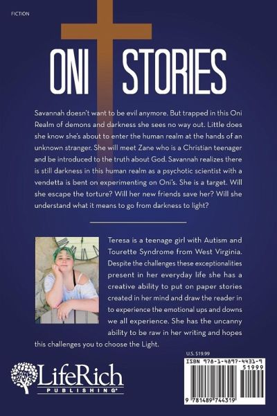 Savannah doesn't want to be evil anymore. But trapped in this Oni Realm of demons and darkness she sees no way out. Little does she know she's about to enter the human realm at the hands of an unknown stranger. She will meet Zane who is a Christian teenager and be introduced to the truth about God. Savannah realizes there is still darkness in this human realm as a psychotic scientist with a vendetta is bent on experimenting on Oni's. She is a target. Will she escape the torture? Will her new friends save her? Will she understand what it means to go from darkness to light?