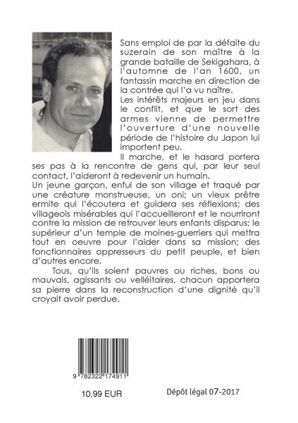 Sans emploi de par la défaite du suzerain de son maître à la grande bataille de Sekigahara, à l'automne de l'an 1600, un fantassin marche en direction de la contrée qui l'a vu naître.Les intérêts majeurs en jeu dans le conflit, et que le sort des armes vienne de permettre l'ouverture d'une nouvelle période de l'histoire du Japon lui importent peu.Il marche, et le hasard portera ses pas à la rencontre de gens qui, par leur seul contact, l'aideront à redevenir humain.Un jeune garçon enfui de son village et traqué par une créature monstrueuse, un oni; un vieux prêtre ermite qui l'écoutera et guidera ses réflexions; des villageois misérables qui l'accueilleront et le nourriront contre la mission de retrouver leurs enfants disparus; le supérieur d'un temple de moines-guerriers qui mettra tout en oeuvre pour l'aider dans sa mission; des fonctionnaires oppresseurs du petit peuple, et bien d'autres encore.Tous, qu'ils soient pauvres ou riches, bon ou mauvais, agissants ou velléitaires, chacun apportera sa pierre dans la reconstruction d'une dignité qu'il croyait perdue.