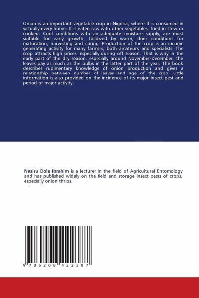 Onion is an important vegetable crop in Nigeria, where it is consumed in virtually every home. It is eaten raw with other vegetables, fried in stew or cooked. Cool conditions with an adequate moisture supply, are most suitable for early growth, followed by warm, drier conditions for maturation, harvesting and curing. Production of the crop is an income generating activity for many farmers, both amateurs' and specialists. The crop attracts high prices, especially during off season. That is why in the early part of the dry season, especially around November-December, the leaves pay as much as the bulbs in the latter part of the year. The book describes rudimentary knowledge of onion production and gives a relationship between number of leaves and age of the crop. Little information is also provided on the incidence of its major insect pest and period of major activity.