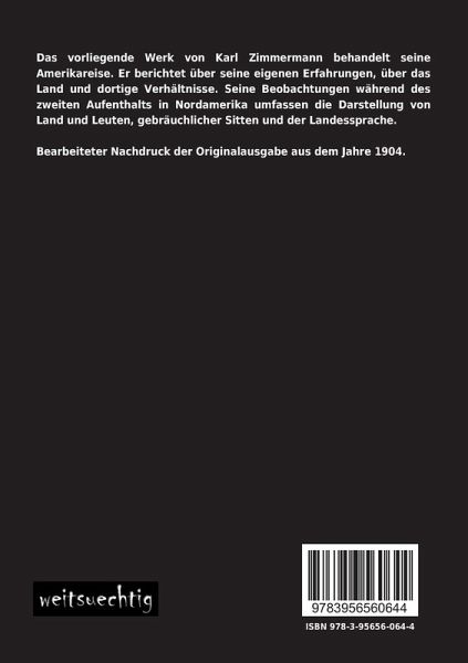Das vorliegende Werk von Karl Zimmermann behandelt seine Amerikareise. Er berichtet über seine eigenen Erfahrungen, über das Land und dortige Verhältnisse. Seine Beobachtungen während des zweiten Aufenthalts in Nordamerika umfassen die Darstellung von Land und Leuten, gebräuchlicher Sitten und der Landessprache.
