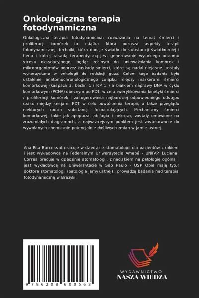 Onkologiczna terapia fotodynamiczna: rozwäania na temat ¿mierci i proliferacji komórek to ksi¿¿ka, która porusza aspekty terapii fotodynamicznej, techniki, która dodaje ¿wiat¿o do substancji ¿wiat¿oczu¿ej i tlenu i której zasad¿ terapeutyczn¿ jest generowanie wysokiego poziomu stresu oksydacyjnego, b¿d¿c zdolnym do uniewäniania komórek i mikroorganizmów poprzez kaskady ¿mierci, które s¿ nadal niejasne, zostäy wykorzystane w onkologii do redukcji guza. Celem tego badania by¿o ustalenie anatomochronologicznego zwi¿zku mi¿dzy markerami ¿mierci komórkowej (kaspaza 3, beclin 1 i RIP 1 ) a biäkiem naprawy DNA w cyklu komórkowym (PCNA) obecnym po PDT, w celu zweryfikowania kinetyki ¿mierci / proliferacji komórek i zasugerowania najbardziej odpowiedniego odst¿pu czasu mi¿dzy sesjami PDT w celu powtórzenia terapii, a tak¿e przegl¿du niektórych rodzin substancji fotouczulaj¿cych. Mechanizmy ¿mierci komórkowej, takie jak apoptoza, atofagia i nekroza, zostäy omówione na zrozumiäych diagramach, a najwäniejszym punktem jest zastosowanie do wywo¿anych chemicznie potencjalnie z¿o¿liwych zmian w jamie ustnej.