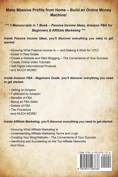 Make Massive Profits From Home – Build an Online Money Machine! Are you curious about the work from home lifestyle? Would you like to make the internet work for you? Do you want to make money in your sleep? If so, look no further: This 3 Manuscripts - Passive Income Ideas, Amazon FBA for Beginners & Affiliate Marketing is what you need! Inside Passive Income Ideas, you’ll discover everything you need to get started: * Knowing What Passive Income Is — and Making It Work for YOU! * Invest In Real Estate * Create a Website and Start Blogging – The Cornerstone of Your Success * Create Online Video Tutorials * Sell Digital Informational Products * Freelancing * and MUCH MORE! Inside Amazon FBA for Beginners, you’ll discover everything you need to get started: * Selling on Amazon * Fulfillment by Amazon * Benefits of FBA * Being an FBA Seller * Details of FBA * The Procedure * and MUCH MORE! Inside Affiliate Marketing, you’ll discover everything you need to get started: * Knowing What Affiliate Marketing Is * Understanding Affiliate Marketing Terms and Lingo * Creating Your Blog/Website – The Cornerstone of Your Success * Identifying and Succeeding on the Top Affiliate Networks * and Using Social Media to Boost Your Affiliate Sales You’ll even learn how to avoid common affiliate marketing scams! Don’t delay – get this valuable information today and start making the most from those powerful income sources!