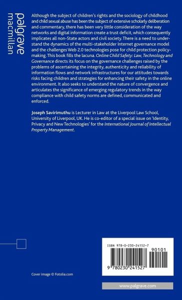 'Online Child Safety: Law, Technology and Governance provides a timely, broad-ranging and well written examination of the key stakeholders, challenges , tensions and legal frameworks which characterise the governance issues associated with online child safety.' - Jo Bryce, COUNTER Project Coordinator & Director of Research Cyberspace Research Unit in the School of Psychology, University of Central Lanashire, UK