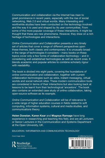 Communication and collaboration via the Internet has risen to great prominence in recent years, especially with the rise of social networking, Web 2.0 and virtual worlds. Many interesting and worthwhile studies have been conducted on the technology involved and the way it is used and shaped by its user communities. From some of the more popular coverage of these interactions, it might be thought that these are new phenomena. However, they draw on a rich heritage of technologies and interactions. Online communication and collaboration presents a very timely set of articles that cover a range of different perspectives upon these themes, both classic and contemporary. It is unusually broad in the range of technologies it considers - many books on these topics cover only a few forms of collaboration technology - and in considering well-established technologies as well as recent ones. It blends academic and popular articles to combine scholarly rigour with readability. The book is divided into eight sections, covering the foundations of online communication and collaboration, together with current collaboration technologies such as wikis, instant messaging, virtual worlds and social network sites. These modern communication tools are considered in terms of their interactions but also looking back at lessons to be learnt from their technological 'ancestors'. The book also contains an extended case study of online collaboration, taking open-source software as its example. Online communication and collaboration will be of relevance in a wide range of higher education courses in fields related to soft computing, information systems, cultural and media studies, and communications theory.