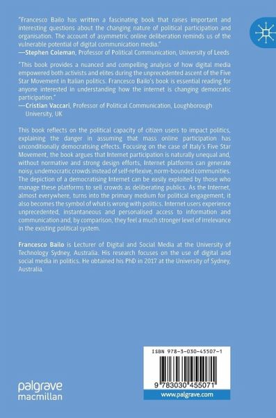 This book reflects on the political capacity of citizen users to impact politics, explaining the danger in assuming that mass online participation has unconditionally democratising effects. Focusing on the case of Italy's Five Star Movement, the book argues that Internet participation is naturally unequal and, without normative and strong design efforts, Internet platforms can generate noisy, undemocratic crowds instead of self-reflexive, norm-bounded communities. The depiction of a democratising Internet can be easily exploited by those who manage these platforms to sell crowds as deliberating publics. As the Internet, almost everywhere, turns into the primary medium for political engagement, it also becomes the symbol of what is wrong with politics. Internet users experience unprecedented, instantaneous and personalised access to information and communication and, by comparison, they feel a much stronger level of irrelevance in the existing political system.