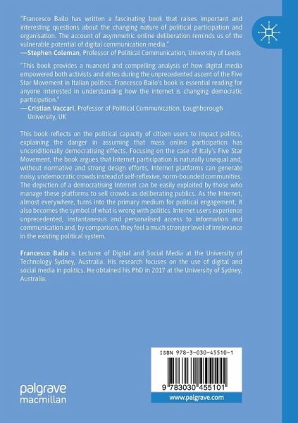 This book reflects on the political capacity of citizen users to impact politics, explaining the danger in assuming that mass online participation has unconditionally democratising effects. Focusing on the case of Italy's Five Star Movement, the book argues that Internet participation is naturally unequal and, without normative and strong design efforts, Internet platforms can generate noisy, undemocratic crowds instead of self-reflexive, norm-bounded communities. The depiction of a democratising Internet can be easily exploited by those who manage these platforms to sell crowds as deliberating publics. As the Internet, almost everywhere, turns into the primary medium for political engagement, it also becomes the symbol of what is wrong with politics. Internet users experience unprecedented, instantaneous and personalised access to information and communication and, by comparison, they feel a much stronger level of irrelevance in the existing political system.