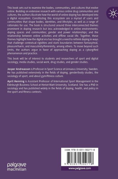 This book examines the bodies, communities, and cultures that evolve in different online doping spaces. By engaging in critical analysis of the interrelatedness of online and offline doped realities, the book provides a comprehensive analysis influenced by digital sociology and feminist theory. It focuses on the intersection of doping, bodies, and technology, and is structured around three interconnected themes prominent in doping research but less acknowledged in online environments: doping spaces and communities; gender and power relationships; and the relationship between online activities and offline social life.