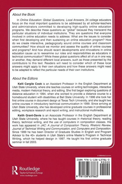 In "Online Education: Global Questions, Local Answers", 24 college educators focus on the most important questions to be addressed by all scholar-teachers and administrators committed to developing high-quality online education programs. We describe these questions as "global" because they transcend the particular situations of individual institutions. They are questions that everyone involved in online education needs to address: What are the issues to consider when first developing and then sustaining an online education program? How do we create interactive, pedagogically sound online courses and classroom communities? How should we monitor and assess the quality of online courses and programs? And how should recent developments and innovations in online education cause us to reexamine our roles and responsibilities as educators in technical communication?While these global questions affect all of us in one way or another, they demand different local answers, such as those presented by the contributors to this text. Readers will need to consider which of these local answers might apply to their own situations and how these answers might need to be adapted to reflect the particular needs of their own institutions.