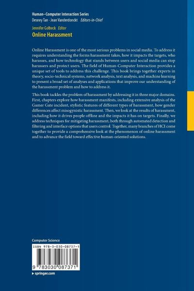 This book tackles the problem of harassment by addressing it in three major domains. First, chapters explore how harassment manifests, including extensive analysis of the Gamer Gate incident, stylistic features of different types of harassment, how gender differences affect misogynistic harassment. Then, we look at the results of harassment, including how it drives people offline and the impacts it has on targets. Finally, we address techniques for mitigating harassment, both through automated detection and filtering and interface options that users control. Together, many branches of HCI come together to provide a comprehensive look at the phenomenon of online harassment and to advance the field toward effective human-oriented solutions.