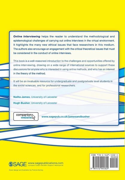 Online Interviewing is a short, accessible and highly practical introduction to designing and conducting online interviews in qualitative research. James and Busher focus on helping the reader to understand the methodological and epistemological challenges of carrying out online interviews in the virtual environment. They highlight the many new ethical issues that face researchers in this medium. The authors also encourage an engagement with the critical theoretical issues that must be considered in the conduct of online interviews. The resulting book is a well-reasoned introduction to the challenges and opportunities offered by online interviewing, drawing on a wide range of international sources to support these discussions. This is an ideal first introduction for anyone who is interested in using online methods, and who has an interest in the theory of the method. It will be an invaluable resource for undergraduate and postgraduate level students in the social sciences, and for professional researchers.