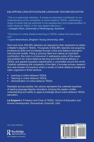 More and more, ESL/EFL teachers are required by their employers to obtain a Master's degree in TESOL. Thousands of ESL/EFL teachers are acquiring professional skills and knowledge through online and distance education instructional models. Filling a growing need and making an important contribution, this book is a forerunner in addressing some of the issues and problems for online distance learning and instructional delivery in TESOL and applied linguistics departments in universities around the world. Carefully addressing the complexity of the field, this volume includes primary research and case studies of programs where a variety of online distance models are used. Structured in a logical sequence, the readable and accessible content represents the collected expertise of leading language teacher educators. Each chapter brings the reader a better understanding and ability to apply knowledge about online distance TESOL education.