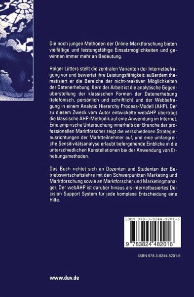 Holger Lütters analysiert die klassischen Formen der Datenerhebung (telefonisch, persönlich und schriftlich) und die Webbefragung in einem Analytic Hierarchy Process-Modell (AHP). Der zu diesem Zweck vom Autor entwickelte webAHP überträgt die klassische AHP-Methodik auf das Internet. Eine empirische Untersuchung innerhalb der Branche der professionellen Marktforscher zeigt die verschiedenen Strategieausrichtungen der Marktteilnehmer auf, und eine umfangreiche Sensitivitätsanalyse erlaubt tiefergehende Einblicke in die unterschiedlichen Konstellationen bei der Anwendung von Erhebungsmethoden.