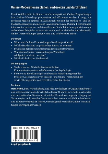 Frank Waible erklärt in diesem essential kompakt, wie Online-Besprechungen bzw. Online-Workshops produktiver und effizienter werden. Er zeigt, wie moderne Medien optimal im Zusammenspiel mit der Methoden- und der Moderationskompetenz eingesetzt werden können, damit Online-Besprechungen interessanter, interaktiver und sinnstiftender für die Teilnehmer gestaltet werden. Anhand von Beispielen erläutert der Autor, welche Methoden und Medien für Online-Veranstaltungen geeignet sind und sich bewährt haben.
