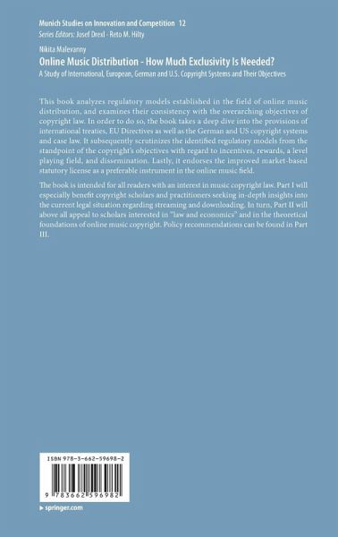 This book analyzes regulatory models established in the field of online music distribution, and examines their consistency with the overarching objectives of copyright law. In order to do so, the book takes a deep dive into the provisions of international treaties, EU Directives as well as the German and US copyright systems and case law. It subsequently scrutinizes the identified regulatory models from the standpoint of the copyright's objectives with regard to incentives, rewards, a level playing field, and dissemination. Lastly, it endorses the improved market-based statutory license as a preferable instrument in the online music field. The book is intended for all readers with an interest in music copyright law. Part I will especially benefit copyright scholars and practitioners seeking in-depth insights into the current legal situation regarding streaming and downloading. In turn, Part II will above all appeal to scholars interested in "law and economics" andin the theoretical foundations of online music copyright. Policy recommendations can be found in Part III.