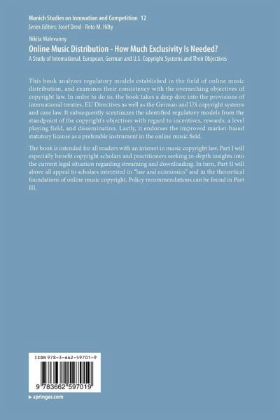 This book analyzes regulatory models established in the field of online music distribution, and examines their consistency with the overarching objectives of copyright law. In order to do so, the book takes a deep dive into the provisions of international treaties, EU Directives as well as the German and US copyright systems and case law. It subsequently scrutinizes the identified regulatory models from the standpoint of the copyright's objectives with regard to incentives, rewards, a level playing field, and dissemination. Lastly, it endorses the improved market-based statutory license as a preferable instrument in the online music field. The book is intended for all readers with an interest in music copyright law. Part I will especially benefit copyright scholars and practitioners seeking in-depth insights into the current legal situation regarding streaming and downloading. In turn, Part II will above all appeal to scholars interested in "law and economics" andin the theoretical foundations of online music copyright. Policy recommendations can be found in Part III.