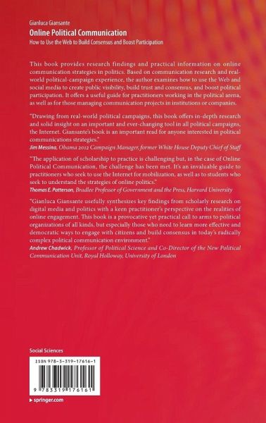 This book provides research findings and practical information on online communication strategies in politics. Based on communication research and real-world political-campaign experience, the author examines how to use the Web and social media to create public visibility, build trust and consensus and boost political participation. It offers a useful guide for practitioners working in the political arena, as well as for those managing communication projects in institutions or companies.