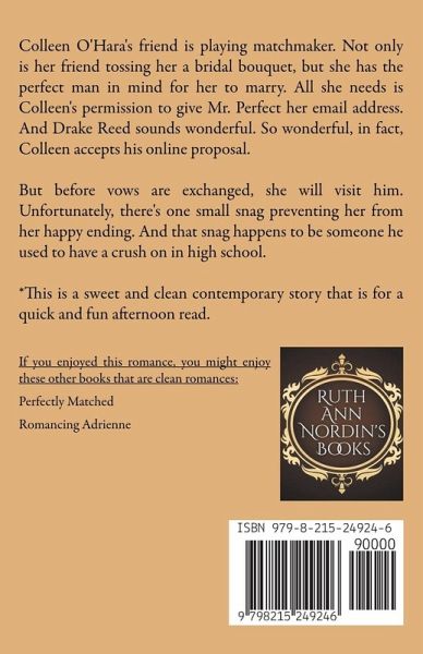 Colleen O'Hara's friend is playing matchmaker. Not only is her friend tossing her a bridal bouquet, but she has the perfect man in mind for her to marry. All she needs is Colleen's permission to give Mr. Perfect her email address. And Drake Reed sounds wonderful. So wonderful, in fact, Colleen accepts his online proposal. But before vows are exchanged, she will visit him. Unfortunately, there's one small snag preventing her from her happy ending. And that snag happens to be someone he used to have a crush on in high school. *This is a sweet and clean contemporary story that is for a quick and fun afternoon read.