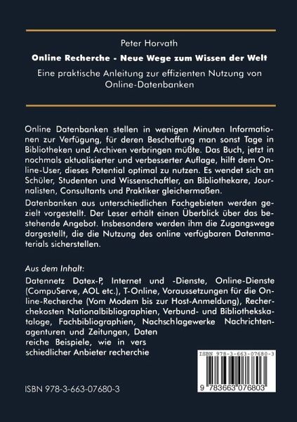 Online-Datenbanken stellen in wenigen Minuten Informationen zur Verfügung, für deren Beschaffung man sonst Tage in Bibliotheken und Archiven verbringen müßte. Das Buch "Online Recherche - Neue Wege zum Wissen der Welt" , jetzt in überarbeiteter und erweiterter Auflage, hilft dem Online-User, dieses Potential optimal zu nutzen. Es wendet sich an Schüler, Studenten und Wissenschaftler, an Bibliothekare, Journalisten, Consultants und Praktiker gleichermaßen.Datenbanken aus unterschiedlichen Fachgebieten werden gezielt vorgestellt. Der Leser erhält einen Überblick über das bestehende Angebot. Insbesondere werden ihm die Zugangswege dargestellt, die die Nutzung des online verfügbaren Datenmaterials sicherstellen.