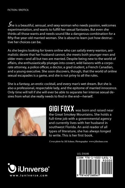 She is a beautiful, sensual, and sexy woman who needs passion, welcomes experimentation, and wants to fulfill her sexual fantasies. But even she thinks all those wants and needs sound like a dangerous combination for a fifty-five-year-old married woman. She is about to learn just how destructive her choices can be. /p> As she begins looking for lovers online who can satisfy every wanton, animalistic desire that her husband cannot, she meets both younger men and older men-and all but two are married. Despite being new to the world of affairs, she enthusiastically plunges into covert, wild liaisons with a corporate attorney, a police officer, a doctor, a grad student, a French Canadian, and a young executive. She soon discovers, though, that the world of online sexual escapades is a game, and she is not privy to all the rules. /p> She is a fantasy, an erotic cocktail, and every man's wet dream. But she is also a professional, respectable lady, and the epitome of married innocence. Only time will tell if she will ever be able to separate her intense sexual desires from what she really needs to find in the end-herself.